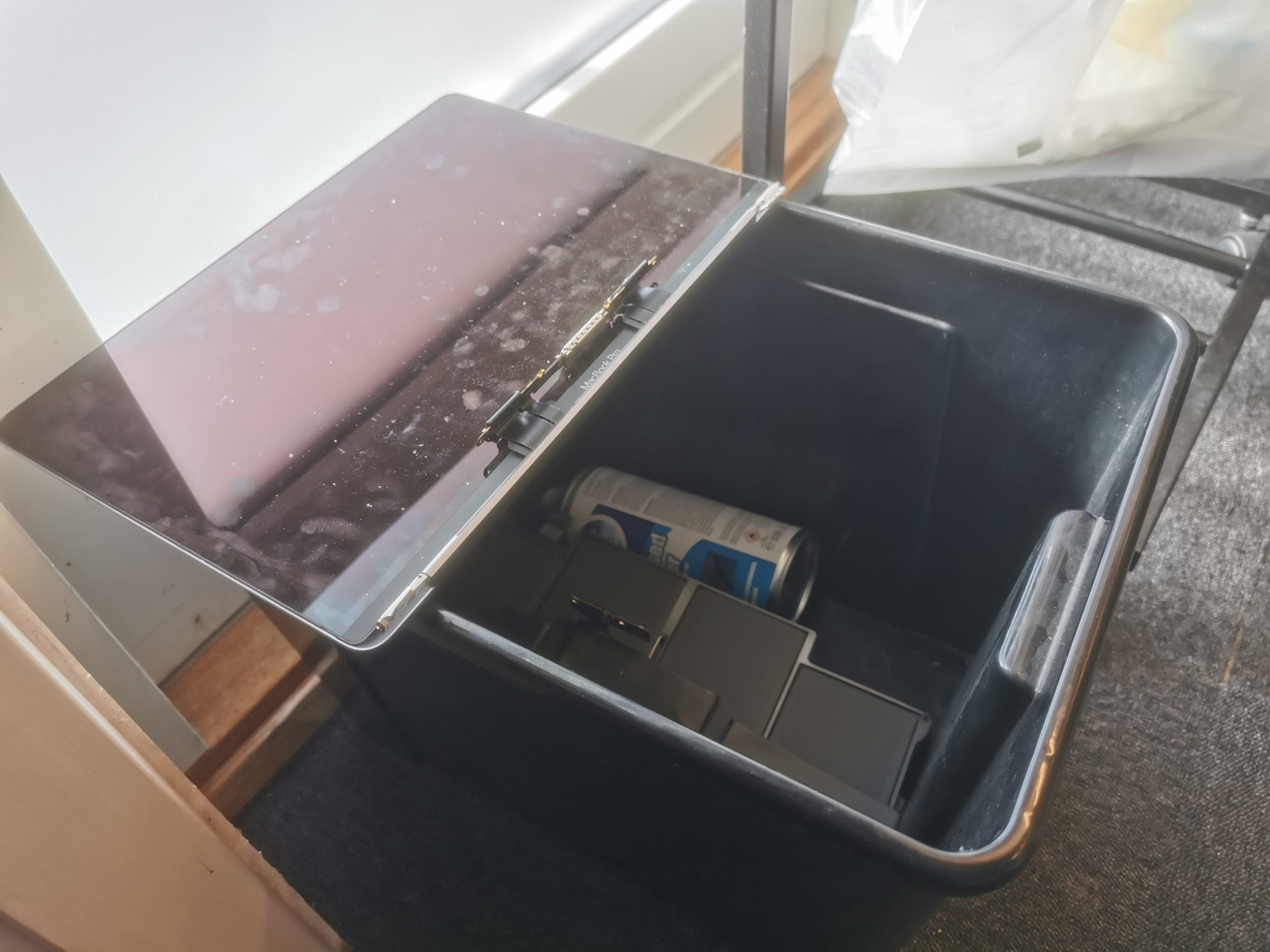 Green Heroes genererer meget begrænsede mængder affald. Her ses den lille sorte kasse, der bruges til udtjente batterier og farligt affald (spraydåse fra trykluft). Ovenpå ligger en ødelagt skærm, der går ind under elektronikaffald.